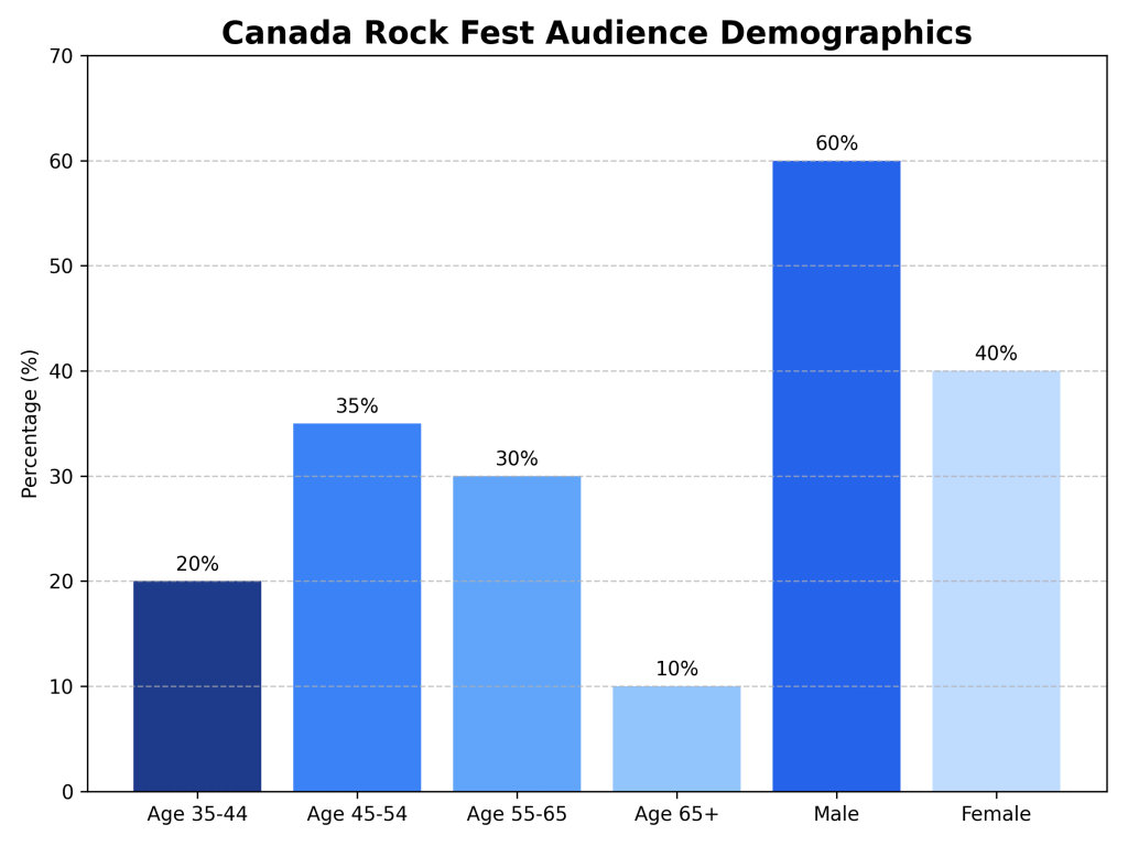 Our audience is made up primarily of adults aged 40 to 70, with the majority in the 50+ range. These are long-time rock music fans with high discretionary income, often traveling for concerts, purchasing premium merchandise, and actively supporting the brands that support their favorite events. Many are homeowners, professionals, business owners, and lifelong music collectors who appreciate authenticity and nostalgia.